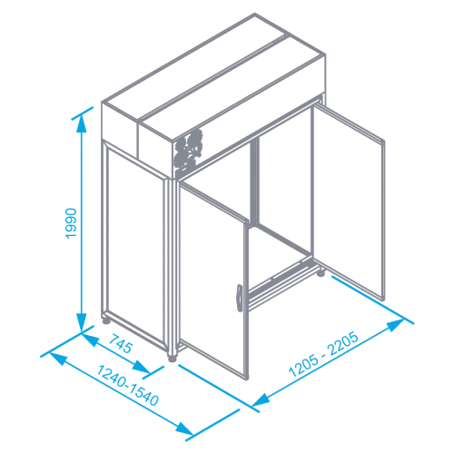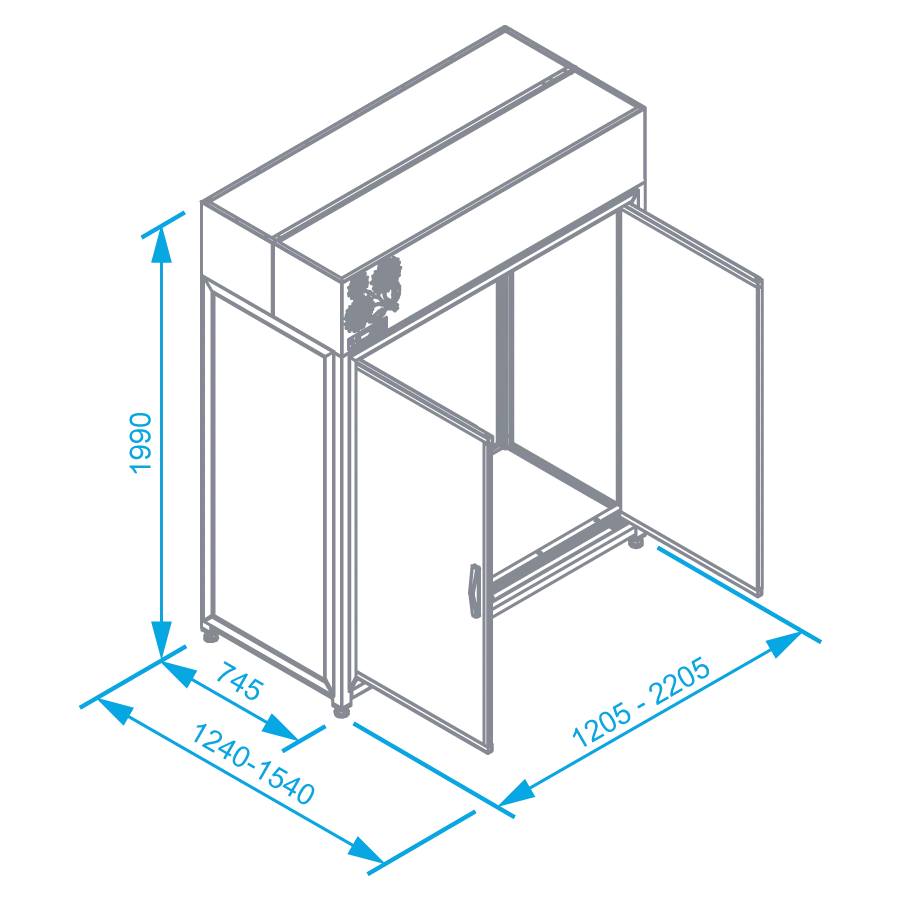 Vonkajšie rozmery (ŠxHxV) | 1205 x 745 x 1990 mm | 1405 x 745 x 1990 mm | 1605 x 745 x 1990 mm | 1805 x 745 x 1990 mm | 2005 x 745 x 1990 mm | 2205x 745 x 1990 mm |